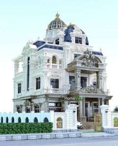 Biệt thự kiểu lâu đài 3 tầng được tọa lạc trên một khu đất rộng, các kiến trúc sư  Trịnh Gia đã thiết kế khoa học kết hợp với không gian cây xanh thoáng mát phù hợp với công năng sử dụng của tùy từng chủ đầu tư. Toàn bộ lâu đài dinh thự là một cung điện nguy nga lộng lẫy, nhìn là đã yêu thích. Được sử dụng hai gam mù chủ đạo là màu trắng và vàng sữa, kết hợp với mái mansard xanh, mái vòm xanh tạo sự năng động, bề thế cho tổng thể ngôi nhà. Không những vậy chúng ta còn bị thu hút bởi những khối hệ thống hoa văn to, cầu kì, tinh tế.